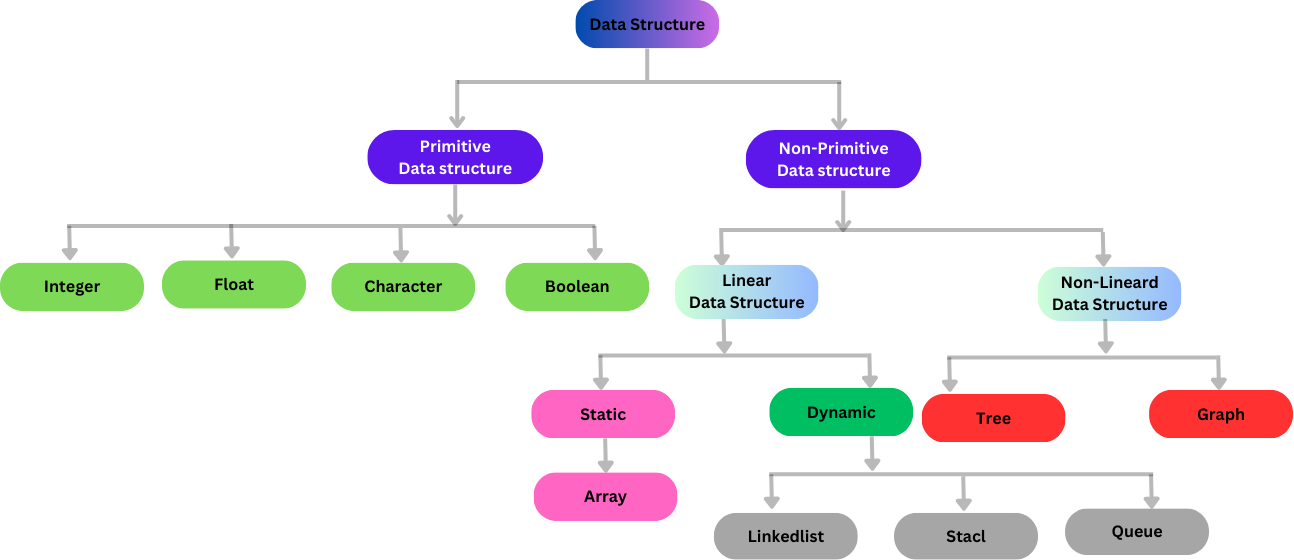 In this section of this article, we are going to be discussing some different types of data structures and an application example of some of this mentioned data structures. There are many different types of data structure, but we are going to categorize them into two sections, which are primitive and non-primitive data structures.